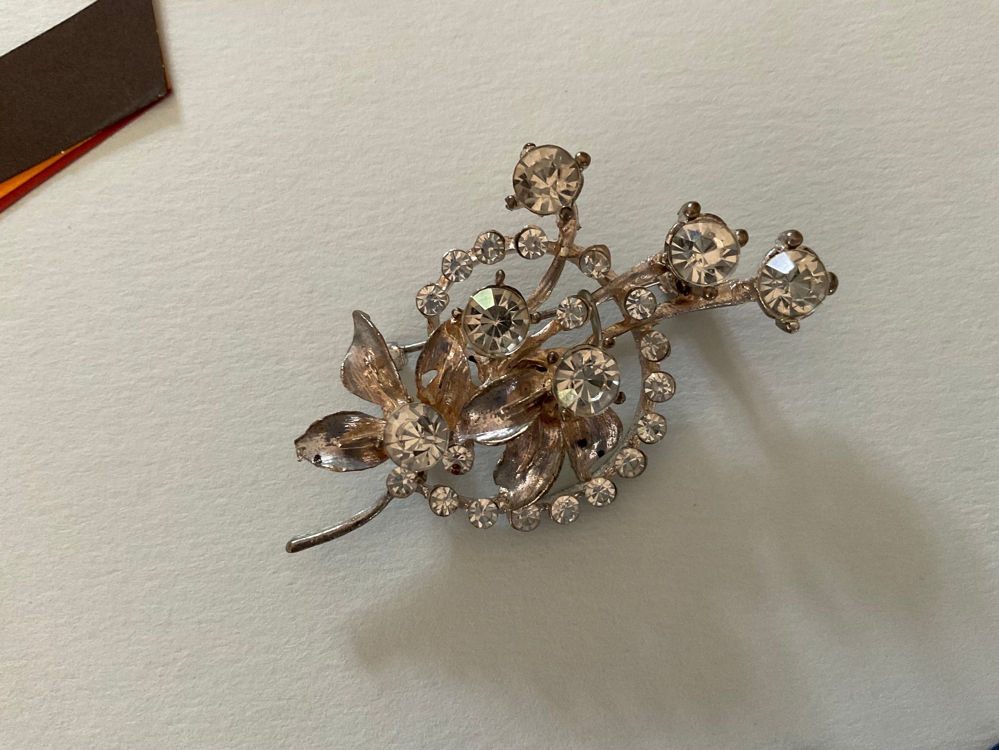Floral spray brooch, two diamanté sizes. Larger stones claw set, others are solid set.